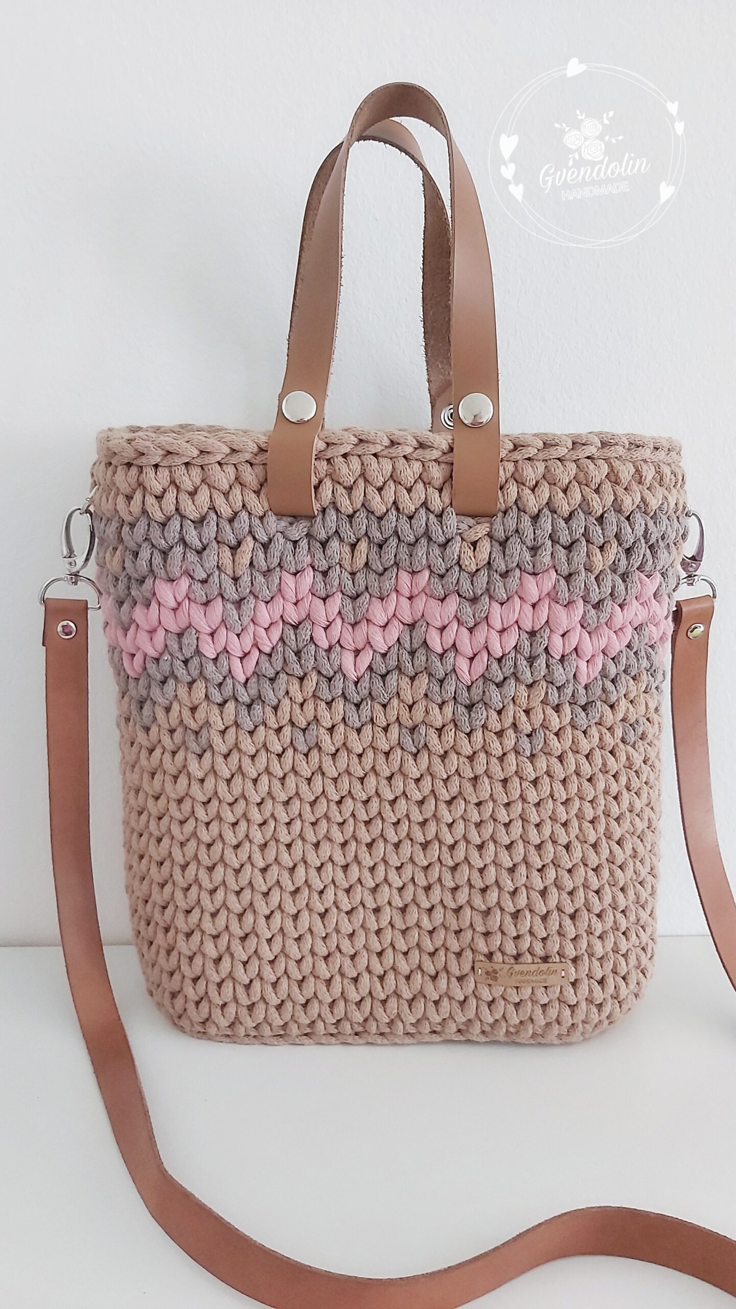 Anyaga: Újrahasznosított pamut zsinórfonal, bőr fogó és pánt, bélését pamut textilből varrom.