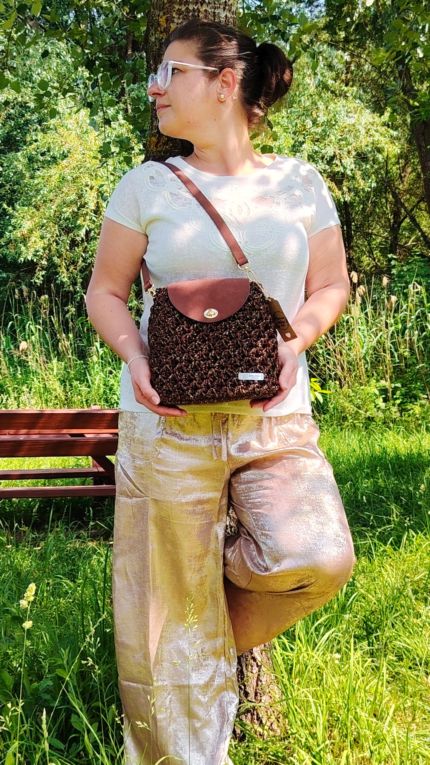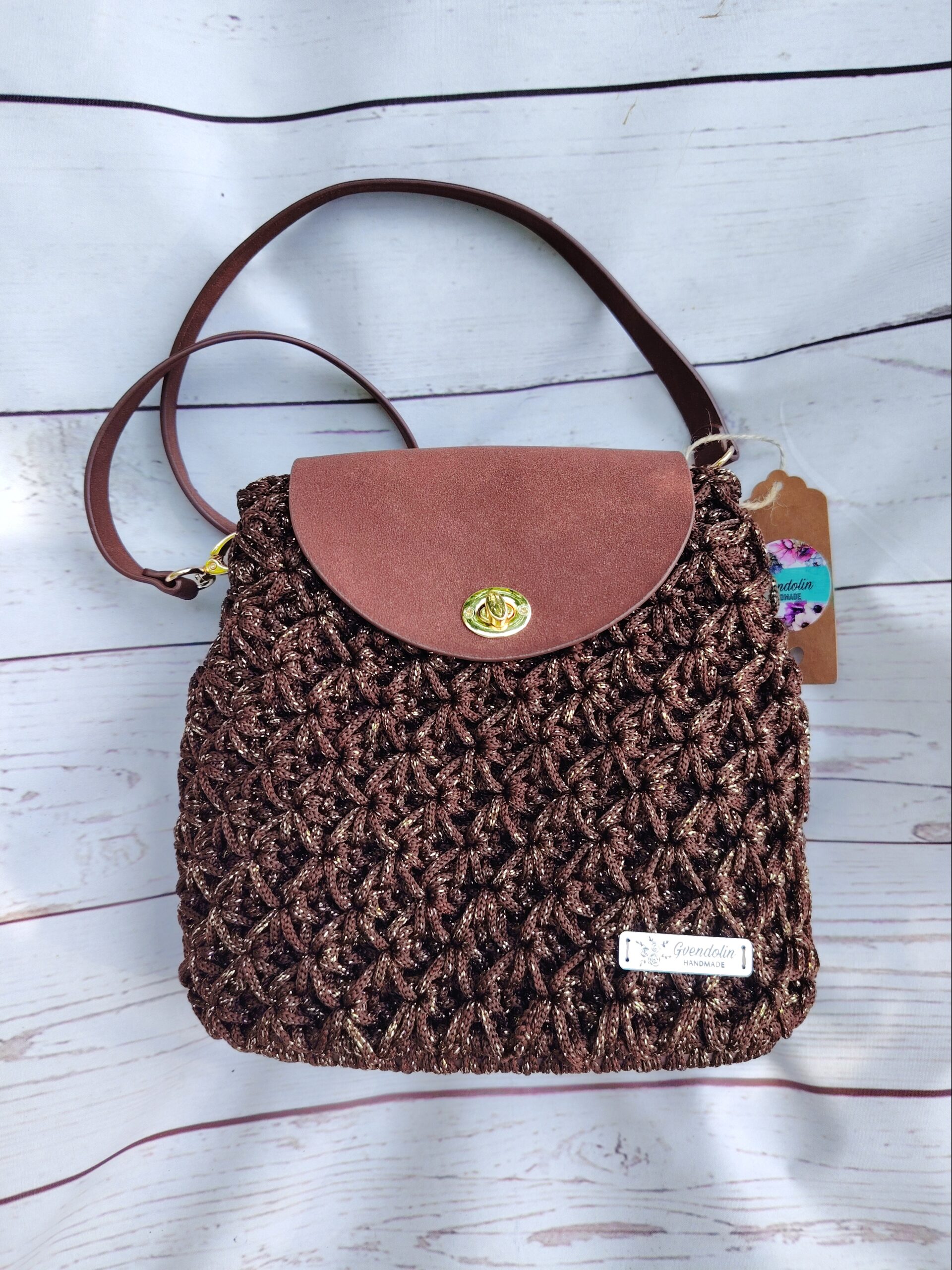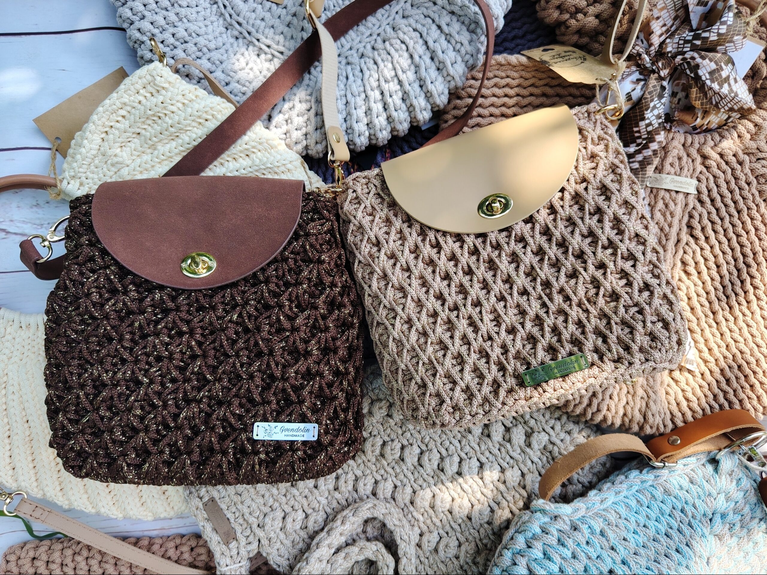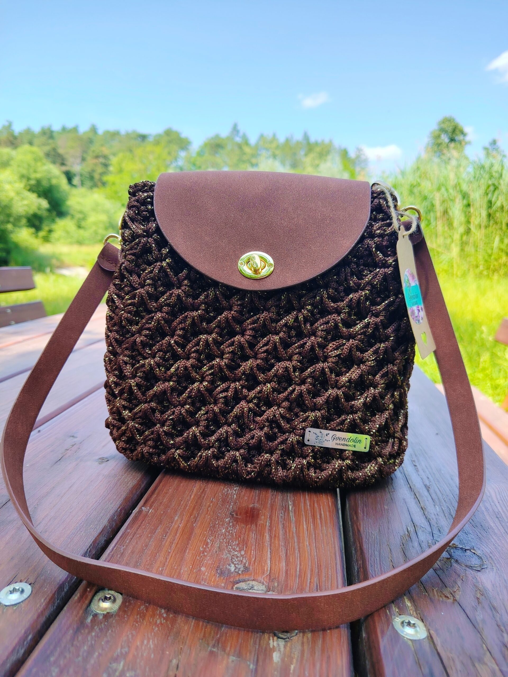 Egyedi horgolt válltáska valódi bőr részletekkel
