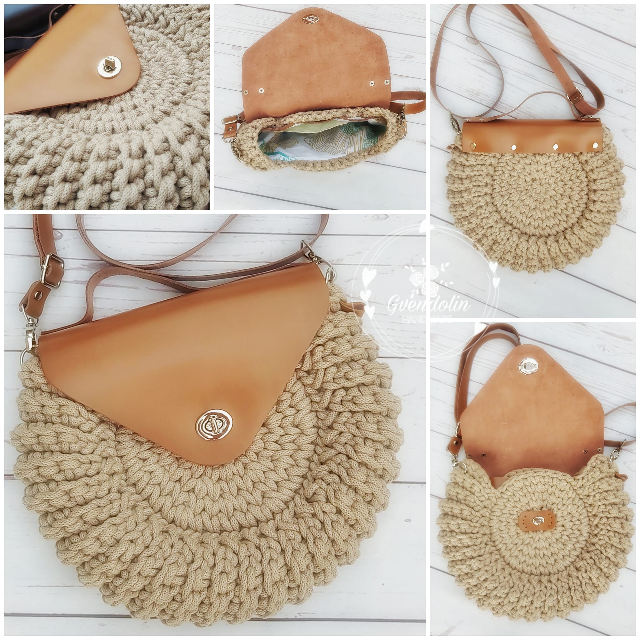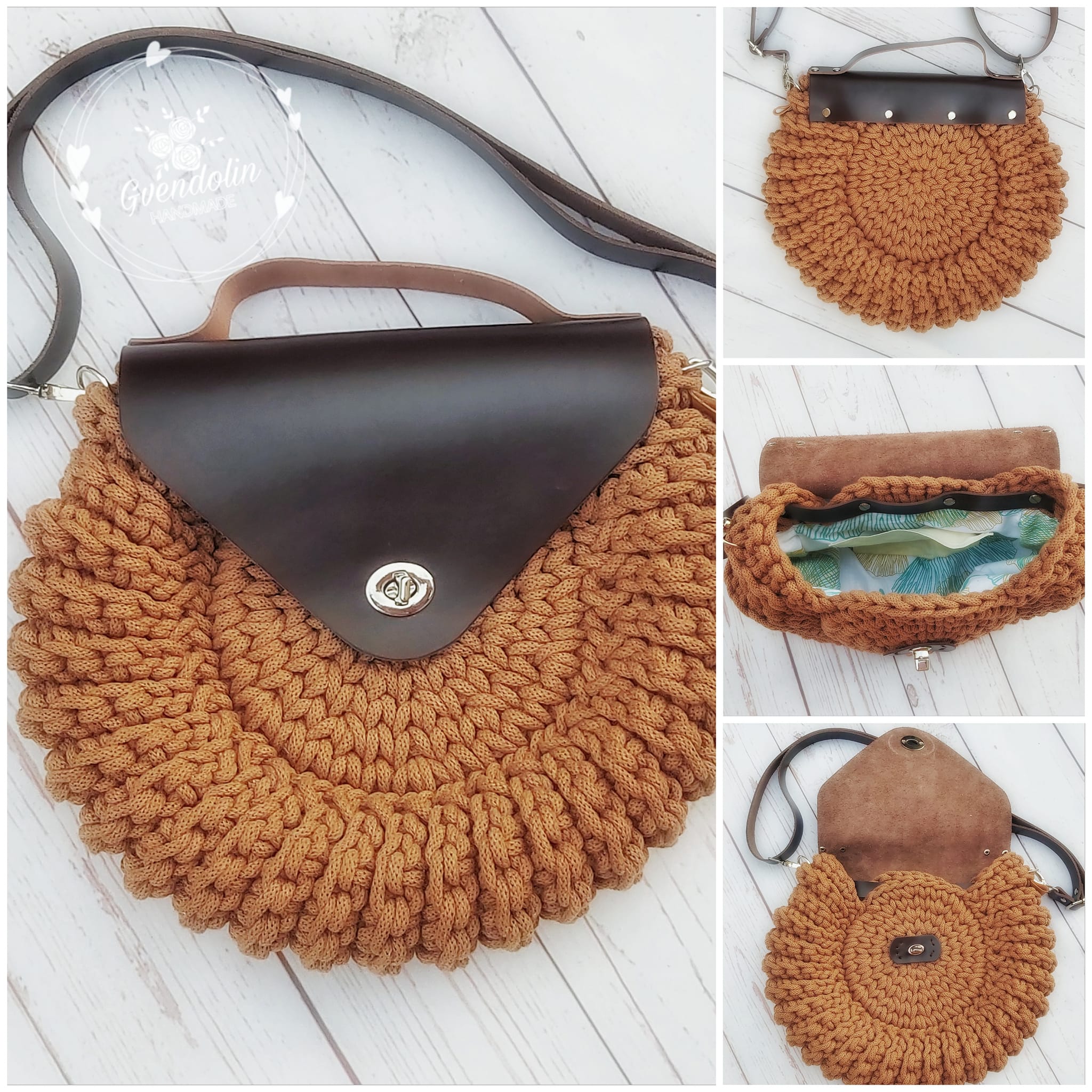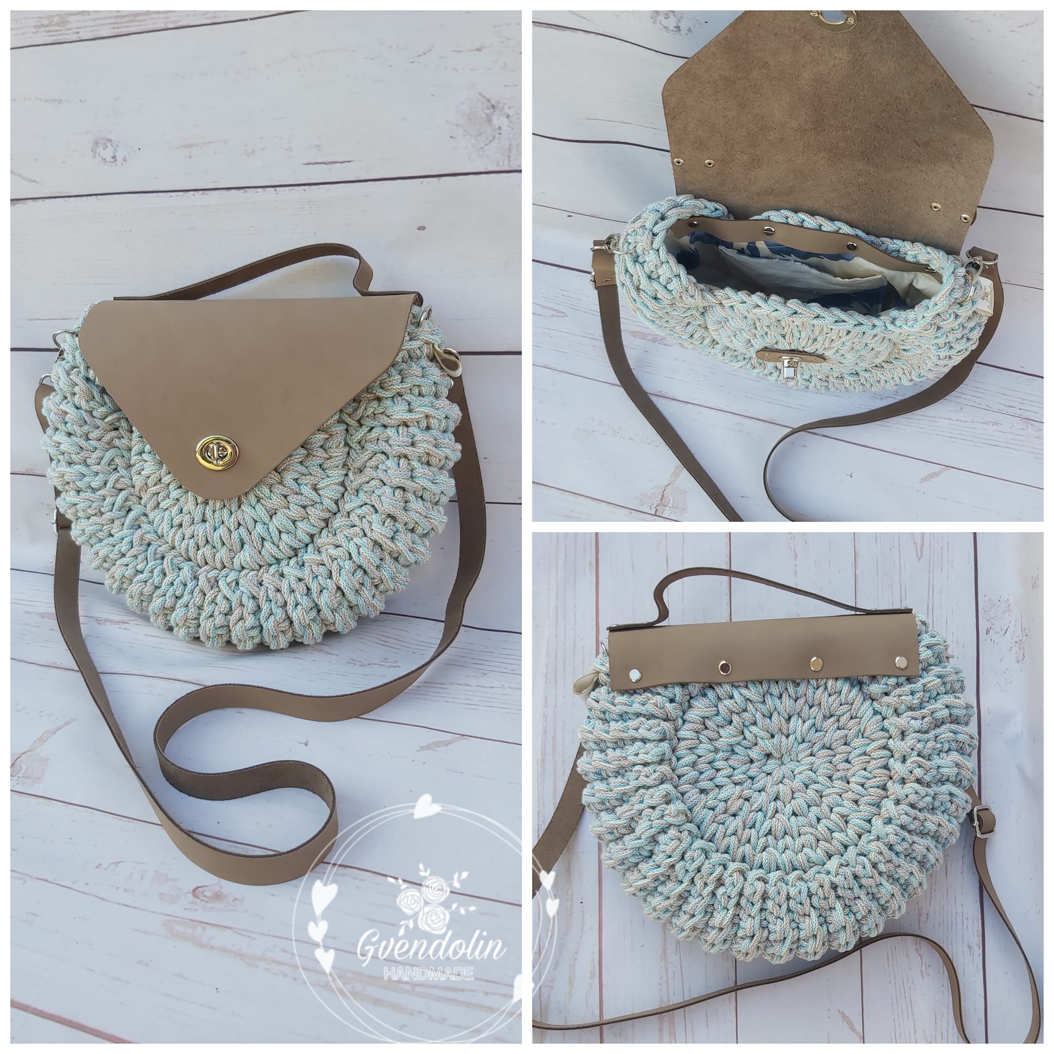 A táska alapanyaga prémium minőségű újrahasznosított 5 mm-es pamut-zsinórfonal, fedele és pántja valódi marhabőr. Bélését pamutból varrom.