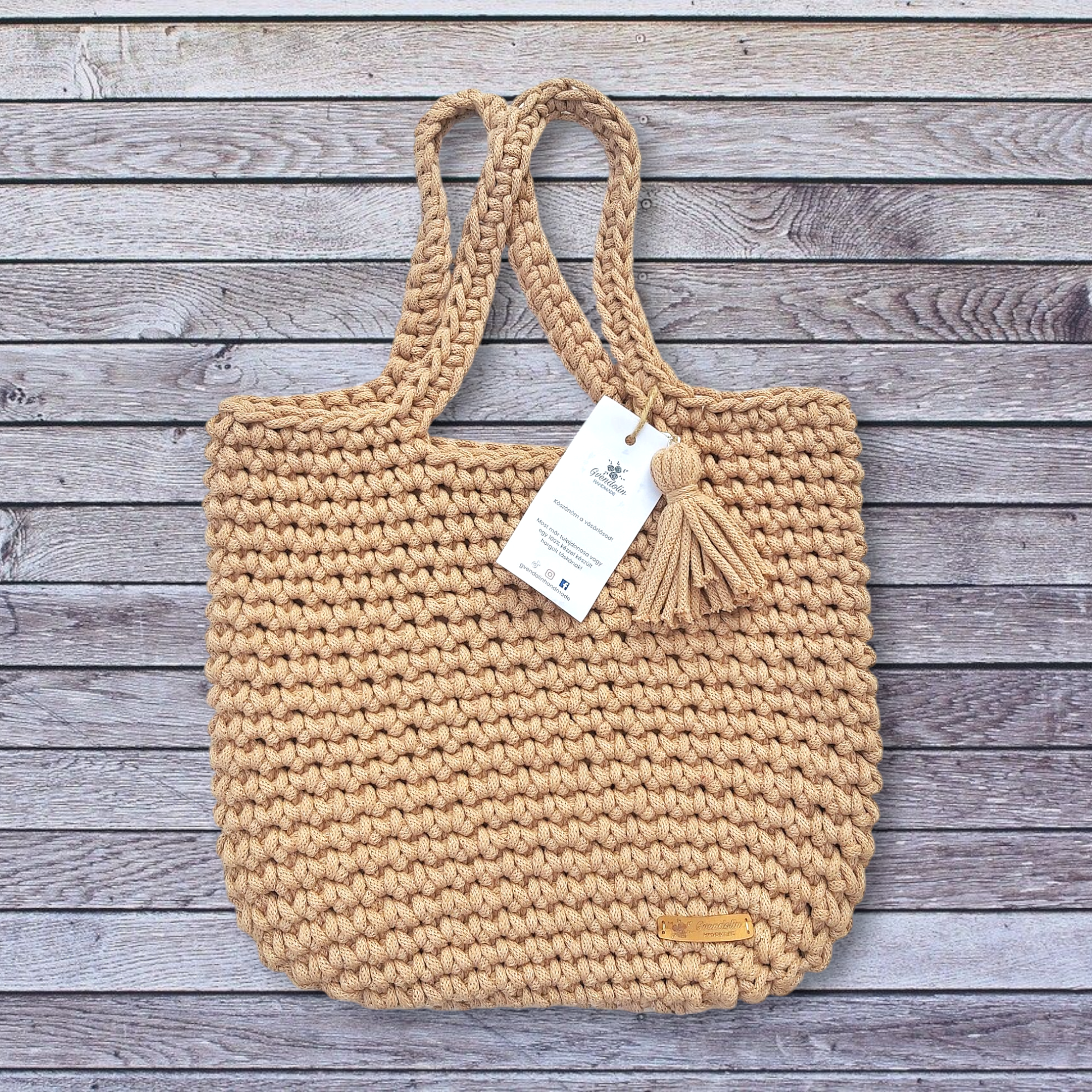 Ez a táska prémium minőségű, újrahasznosított 5 mm-es pamut zsinórfonalból készül – tartós, mégis puha anyag, amely környezettudatos választás is egyben.